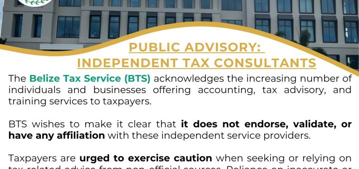 The Belize Tax Service (BTS) reminds taxpayers that we are not affiliated with or responsible for any independent individuals or businesses offering tax advice, accounting services, or training.