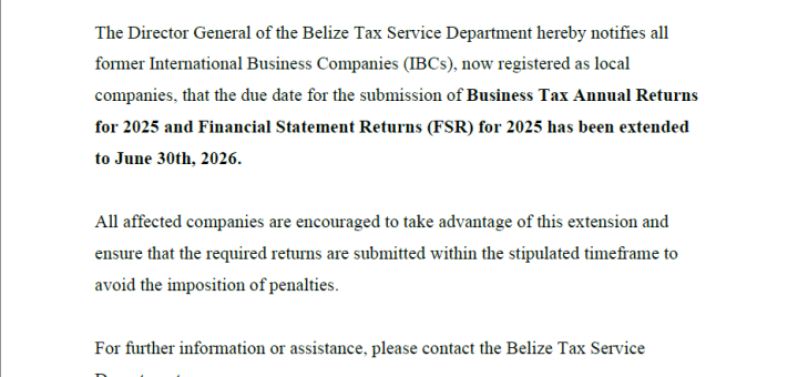 The Director General of the Belize Tax Service Department hereby notifies all former International Business Companies (IBCs), now registered as local companies, that the due date for the submission of Business Tax Annual Returns for 2025 and Financial Statement Returns (FSR) for 2025 has been extended to June 30th, 2026.
